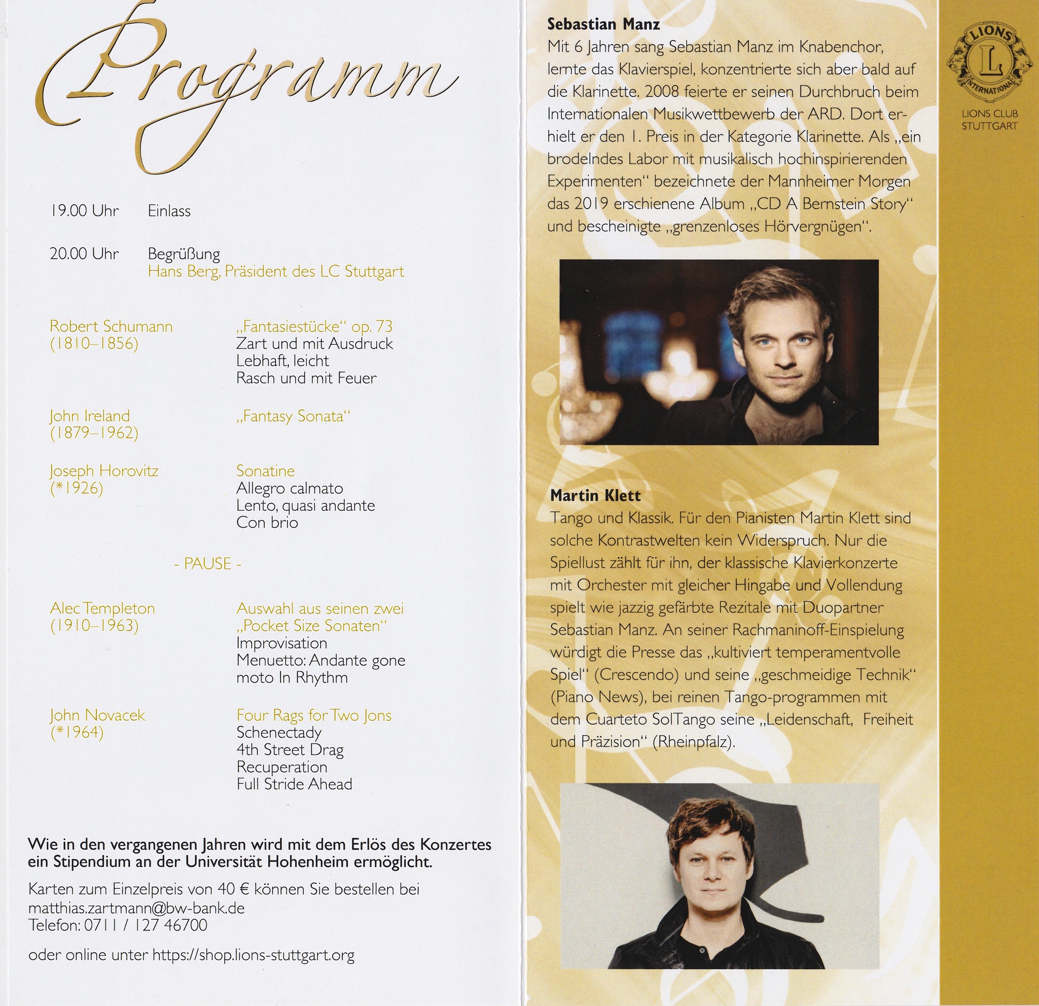 Ein kongeniales Duo, diese beiden Musiker an Klavier und Klarinette: Martin Klett und Sebastian Manz suchten zunächst mit Robert Schumann einen romantisch zarten Zugang zum Publikum, das nach wenigen Sekunden in ihren Bann geschlagen war. Mit einer Mischung aus Klassik, Jazz und Swing schufen die beiden sympathischen und spiellaunigen Musiker einen fulminanten Wiederbeginn des traditionellen Benefizkonzerts des Lions Club Stuttgart nach 2jähriger Corona-Pause.