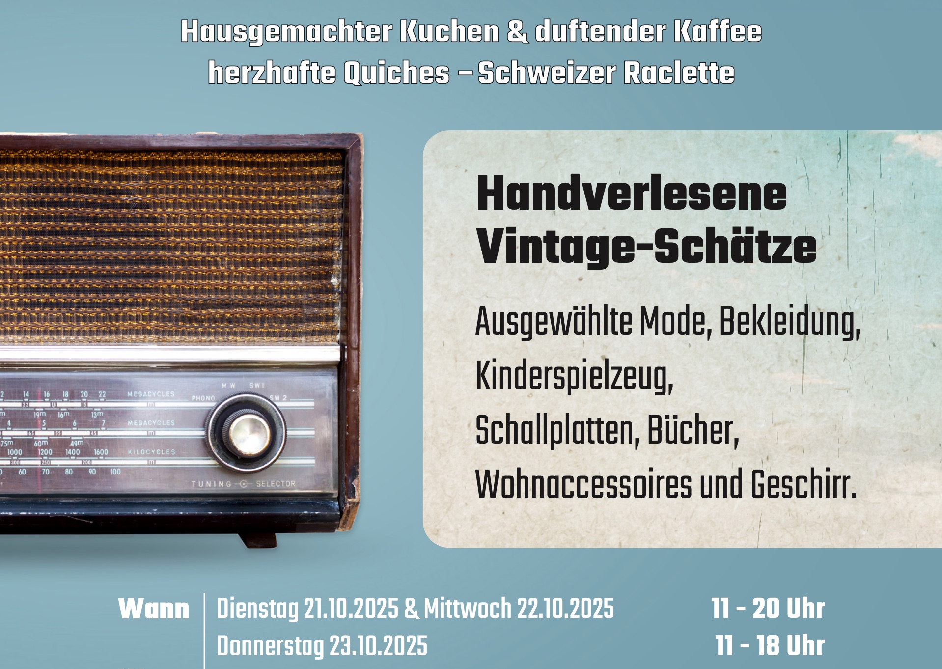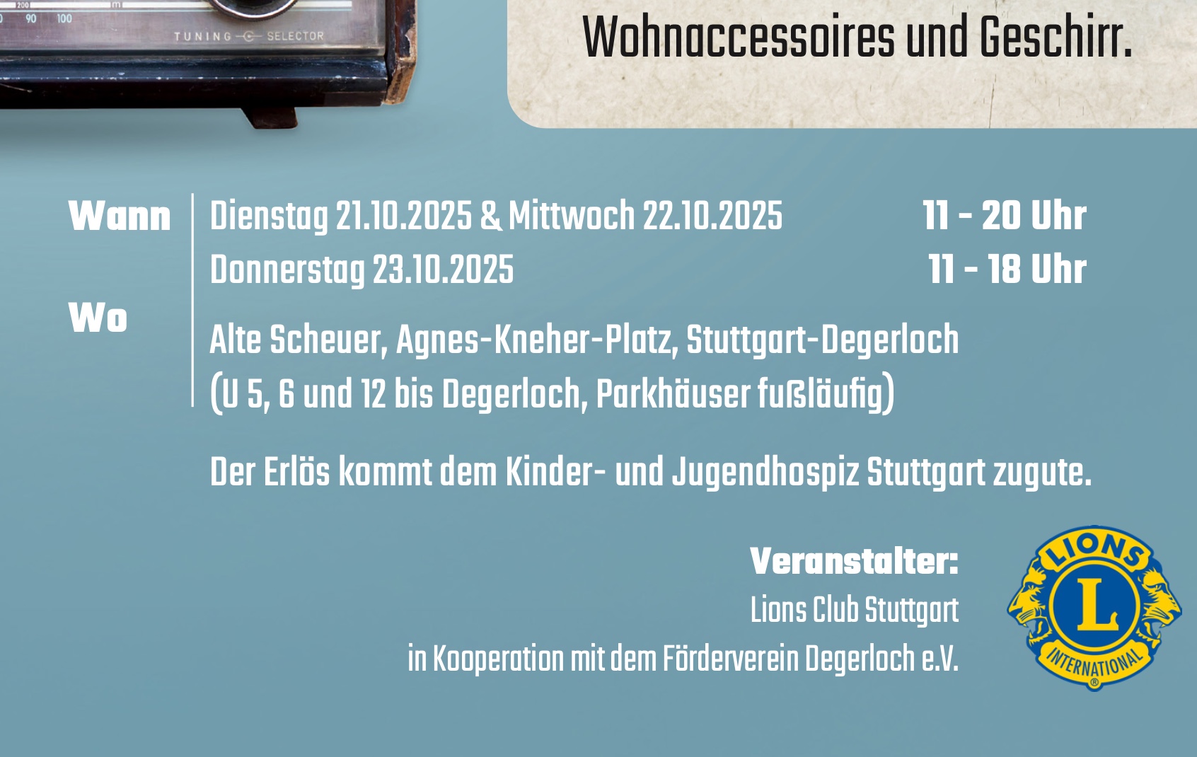 Die Damen des Lions Club Stuttgart organisieren vom 21.-23. Oktober 2025 einen exklusiven Vintage-Markt ... mit duftendem Kaffee, hausgemachtem Kuchen, herzhaften Quiches und Schweizer Raclette. - Ein schönes Ambiente, um handverlesene Vintage-Schätze zu entdecken, zu verkaufen und so dringend erforderliche Unterstützung für das Kinder- und Jugendhospiz in Stuttgart zu leisten.
